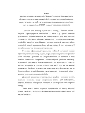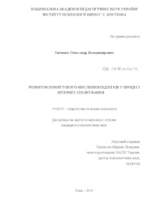 Dissertation is dedicated to development of adolescents’ conceptual thinking in network communication. Analysis of theoretical sources connected with problems of teenagers’ conceptual thinking, Internet communication as a psychological phenomenon and specificity of its effect on the personality’s cognitive sphere is done. Possibility of managing forming impact on teenager’s verbal and logical structures with using elements of the network communication is theoretically proved in the context of designing and technological paradigm. Features of intellectual training as a form of studying are considered. Dynamics of the operating structure of conceptual thinking in adolescence is empirically investigated (analysis, generalization, abstraction, classification, logical reasoning) – peculiarities of its transformation and extent of integration are disclosed. Changes of the basic characteristics of teenagers’ Internet communication are found – significance, subjects, intensity, use of expressive means. Based on factor analysis main groups of motives of Internet using in the range of 13 – 15 years are revealed. Research of connection between development of conceptual thinking operations with online communication indicators is conducted, which showed absence of significant correlations for majority of variables. Based on the analysis of theoretical sources and results of the ascertaining experiment blended training of adolscents’ conceptual thinking is developed and implemented, which involved a combination of direct interaction and online communication in social networks. Efficiency of the committed formative influence is proved on the basis of diagnostic testing and using criteria tasks.