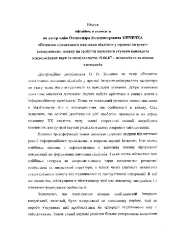 - Зінченко, О.В. (orcid.org/0000-0002-9104-2585) (2016) Development of teenagers’ conceptual thinking in the Internet communication UNSPECIFIED thesis, Інститут психології імені Г.С. Костюка.