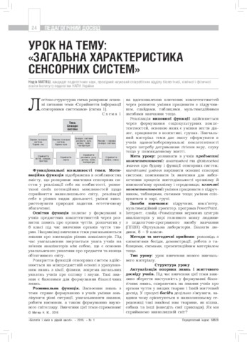 - Матяш, Н.Ю. (orcid.org/0000-0002-9103-4235) (2016) General characteristics of sensory systems lesson Біологія і хімія в рідній школі, 1 (113). pp. 24-26.