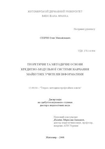 - Спірін, О.М. (orcid.org/0000-0002-9594-6602) (2009) Theoretical and methodological foundations of the credit-modular system of informatics teachers training Masters thesis, Житомирський державний університет імені Івана Франка.