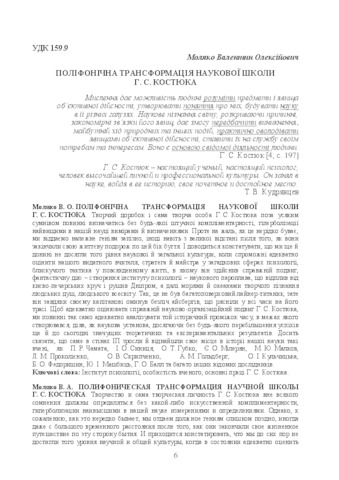 - Моляко, В.О. (2016) Polyphonic transformation of H. S. Kostiuk’s scientific school Актуальні проблеми психології: Збірник наукових праць Інституту психології імені Г.С. Костюка НАПН України, 22 (12). pp. 6-12. ISSN 2072-4772