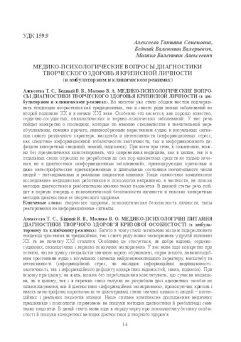 ). It is in much a triviality to underline the tendencies of growth of traditional and some kind of new diseases in the second half of XX and the beginning of XXI century. It particularly regards, as it is well known, cardiovascular, oncologic and neuropsychic diseases. We may speak specifically about the last, which in specialists’ opinion substantially determined, in addition, by the avalanche-type growth of audial and visual signals of different character, scale and intensity (informational stress, as a result of informational redundancy-randomness, and informational deficit of concrete data, knowledge, hints). For all that, unfortunately, we may without exaggeration state, that modern medicine, as in general and in its separate fields did not develop yet adequate means not only treatment, but diagnostics of “informational diseases”, which provoke crisis and even catastrophic short and long-term states of great amount of people – potential and real patients of a clinic. Our common complex research of medical workers and psychologists is directed, in particular, on the search of methodics of diagnostics and rehabilitation namely such patients. In this article we may speak in first tern about personality’s psychological safety and searching of certain methodics of its creative health diagnostics.