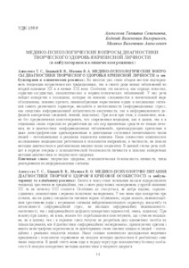- Алексєєва, Т.С., Бідний, В.В. and Моляко, В.О. (2016) Medical-psychological questions of the crisis personality’s creative health diagnostics (in ambulatory and clinical regimens) Актуальні проблеми психології: Збірник наукових праць Інституту пси-хології імені Г.С. Костюка НАПН України. – Т. ХІІ. Психологія творчості, 22. pp. 14-21. ISSN 2072-4772