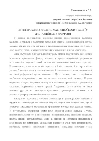 - Коневщинська, О.Е. (2011) Some problems of man-machine communication in distance education. In: Звітна наукова конференція Інституту інформаційних технологій і засобів навчання НАПН України: Матеріали наукової конференції . ІІТЗН НАПН України, м. Київ, Україна, pp. 20-22.