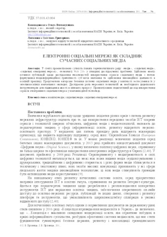 - Коневщинська, О.Е. and Литвинова, С.Г. (2016) Electronic social networks as a component Modern social media Інформаційні технології і засоби навчання НАПН України, 5 (55). pp. 42-54. ISSN 2076-8184