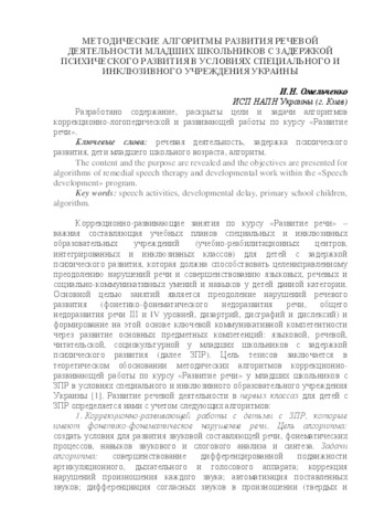 - Омельченко, Ірина Миколаївна (2016) Methodical algorithms of speech activity of primary school children with a delay of mental development in the context of special and inclusive institutions of Ukraine In: Инклюзивные процессы в образовании: материалы Междунар. конф., г. Минск, 27–28 окт. 2016 г . БГПУ, м. Мінськ, Білорусь, pp. 236-240. ISBN 978-985-541-296-1
