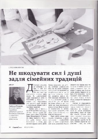 - Токарєва, Людмила Дмитріївна (2016) Do not spare forces and souls to family tradition Справи Сімейні, 2 (218). pp. 26-27. ISSN 2308-8095