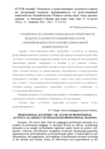 - Ягупов, Василь Васильович (2016) Рrofessional autonomy or actor of professional activity as a result of pedagogues professional training In: Розвиток сучасної освіти: теорія, практика, інновації : зб. Матеріалів ІІ Міжнар. наук.-практ. конф., Київ, 25–26 лютого 2016 р . Міленіум, м. Київ, Україна, pp. 324-325.