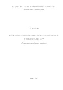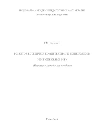In training manual covers theoretical and methodological aspects of the study of aesthetic competence of children with visual impairments. As a result of theoretical and empirical studies found features of development and formation of aesthetic competence of children with visual impairments at preschool age, research is theoretically grounded conceptual approaches to the formation of aesthetic competence of preschoolers with visual impairments. Defines the main components of aesthetic competence: the motivational value of cognitive evaluation of the emotional-communicative perceptual activity, but also have their peculiarities in preschoolers with visual impairments.