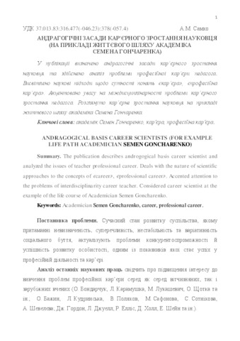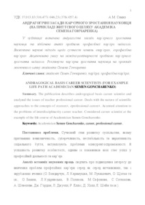 The publication describes androgogical basis career scientist and analyzed the issues of teacher professional career. Deals with the nature of scientific approaches to the concepts of «career», «professional career». Accented attention to the problems of interdisciplinarity career teacher. Considered career scientist at the example of the life course of Academician Semen Goncharenko.