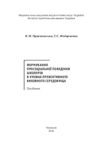 Оржеховська, В. М. and Федорченко, Т. Є. (2016) Formation of prosocial behavior of students in the conditions of preventive educational environment . Чабаненко Ю. А., Черкаси. ISBN 978-966-920-149-2