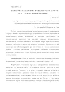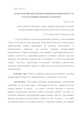 - Грись, А.М. (2015) Psychological mechanisms of self-image functioning of persons with different types of character Актуальні проблеми психології, 13 (11). pp. 22-30. ISSN 2072-4772
