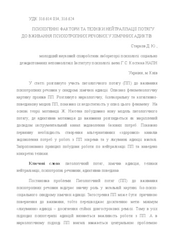 - Старков, Д.Ю. (2015) Psychogenic factors and neutralization techniques for chemical addicts’ craving to consumption of psychoactive substances. Актуальні проблеми психології, 13 (11). pp. 256-267. ISSN 2072-4772