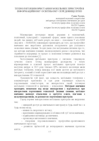 - Ткачук, Г. Е. (2016) The technology of using mobile devices in the information educational environment of vocational and technical institutions In: Науково-методичне забезпечення професійної освіти і навчання , 1 . Інститут професійно-технічної освіти НАПН України, м. Київ, Україна.