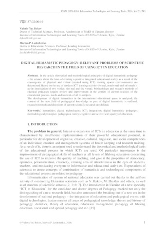 - Биков, В.Ю. and Лещенко, М.П. (2016) Digital Humanistic Pedagogy: Relevant Problems of Scientific Research in the Field of Using ICT in Education Інформаційні технології і засоби навчання, 3 (53). pp. 1-17. ISSN 2076-8184