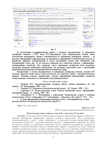 - Маркова, О. М. (orcid.org/0000-0002-5236-6640) (2016) Models of using cloud technologies at the IT professionals training Науковий часопис НПУ імені М. П. Драгоманова. Серія №2. Комп’ютерно-орієнтовані системи навчання, 18 (25). pp. 85-94. ISSN 2411-8869