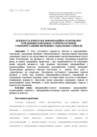 - Соколюк, О.М. (2016) The work of the teacher in the information educational environment of learning using the network of social services Наукові записки. – Серія: Проблеми методики фізико - математичної і технологічної освіти, 1 (10). pp. 189-195. ISSN 2519-254X