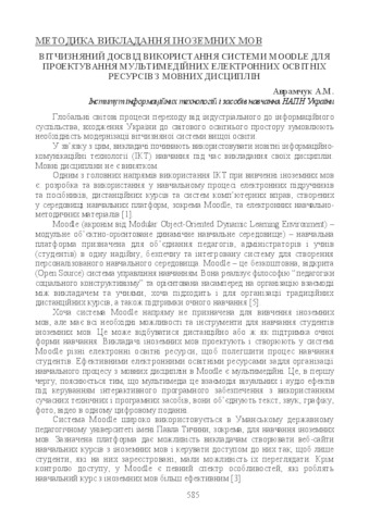 - Аврамчук, Антон Миколайович (orcid.org/0000-0002-2868-0541) (2016) Domestic experience in the use of the Moodle system for designing multimedia electonic educational resources for language disciplines In: Україна і світ: діалог мов та культур: матеріали міжнародної науково- практичної конференції, 30 березня – 1 квітня 2016 року . КНЛУ, м. Київ, Україна, pp. 585-586.