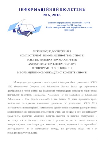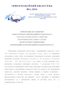 - Гриценчук, О.О. (2016) International Computer and Information Literacy Study (ICILS 2013) as a tool for the evaluation of information and communication competence ІІТЗН НАПН України, м.Київ, України.