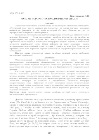 - Кондратенко, Лариса Олександрівна (2013) The role of metaphors in psychological knowledge Психологія обдарованості, 9 (6). pp. 209-2016. ISSN 2072 4772