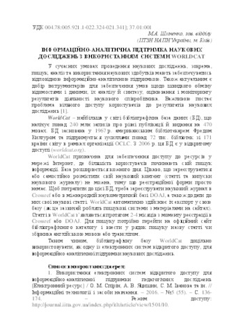 In modern conditions for scientific research, including search, analysis and use of scientific achievements have ensured appropriate information and analytical support. Also important is the selection of tools to ensure conditions for the rapid exchange of information and data, analysis and synthesis, evaluation and monitoring of performance of the researcher. An important problem arises users free access to research results. WorldCat - the world's largest bibliographic database with more than 240 million records of various publications and editions in 470 languages.