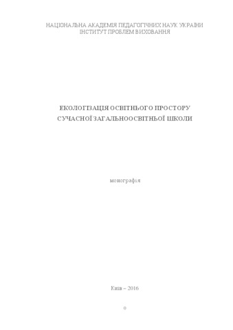 The book provides a set of theoretical foundations, teaching conditions and practical approaches to the ecologization of the educational space of the educational institution. Un the monograph the educational value space contains the system of components, the combined ideas of environmental responsibility, sustainable development of society, the valuable relation to nature, biodiversity, resource use economical and ecological safety of the environment. It offers a series of training programs for general and out-of-school educational institutions that reflect the current trends of the spatial approach to environmental pedagogy. Also it is presented the organizational approaches to ecologization of family, leisure time, and daily routines. Application of the suggested approaches in the publication contributes to the formation eco-centred type of personality. The monograph is intended for researchers, students, teachers, practitioners, educators, out-of-school institutions and all concerned to save the environment.