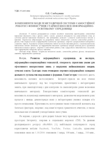 - Слободяник, О.В. (2016) The components of the methodical system of physics test for senior students in information and education process Наукові записки. Серія: Проблеми методики фізико-математичної і технологічної освіти, 1 (10). pp. 179-189. ISSN 2519-254X