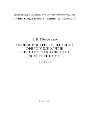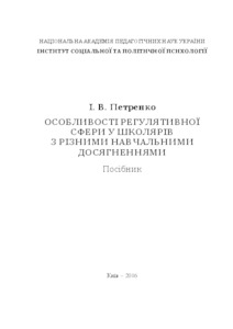 Петренко, Ірина Володимірівна (orcid.org/0000-0002-5900-0852) (2016) Features of the regulatory sphere of pupils with different educational achievements . Видавництво “Міленіум”, м. Київ, Україна. ISBN 978-966-8063-79-4