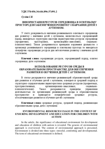 - Сухіна, І.В. (2015) Environmental resources usage in the context of ensuring development and education for children with autism Osoblyva dytyna: navchannia i vykhovannia, 1 (73). pp. 41-49. ISSN 2312-2781