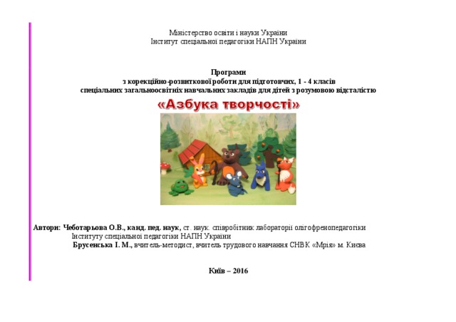 - Чеботарьова, О. В. (orcid.org/0000-0002-4560-3708) and Брусенська, І.М. (2016) "Азбука творчості" (підготовчий, 1-4 класи): програми з корекційно-розвиткової роботи для підготовчих, 1-4 класів спеціальних загальноосвітніх закладів для дітей з розумовою відсталістю [Teaching Resource]