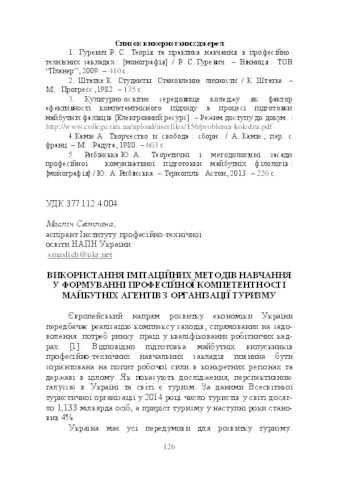 - Масліч, Світлана Володимирівна (2016) Using the simulation teaching methods in the formation of professional competence of agents of tourism In: Розвиток професійної культури майбутніх фахівців: виклики, досвід, стратегії і перспективи . ІМА-прес, м. Павлоград, Україна, pp. 126-129.
