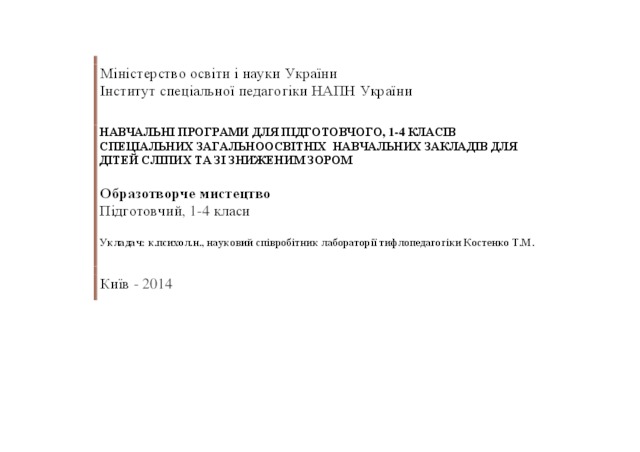 - Костенко, Т.М. (orcid.org/0000-0002-4976-1236) (2014) Educational programs for preparatory, 1-4 classes special secondary schools for blind and children with visual impairments: Fine art, preparatory, 1-4 classes [Teaching Resource]