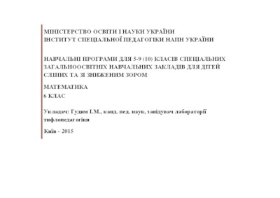 - Гудим, І.М. (2014) Educational programs for 5-9 (10) classes special secondary schools for blind and children with visual impairments. "Mathematics, 6 class" [Teaching Resource]
