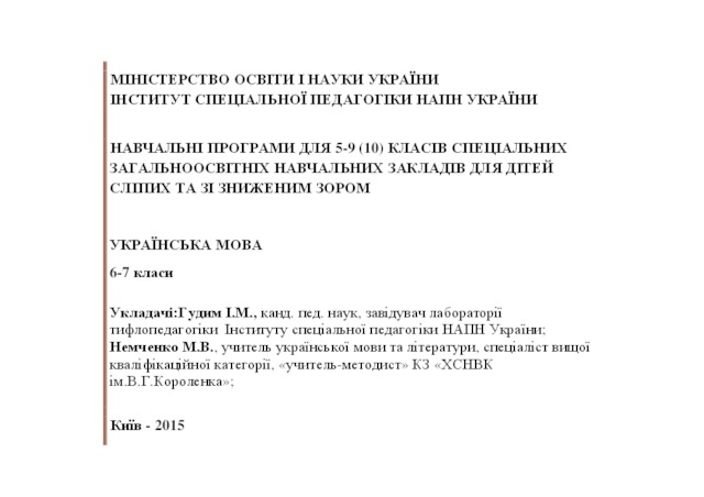 - Гудим, І.М. and Немченко, М.В. (2015) Educational programs for 5-9 (10) classes special secondary schools for blind and children with visual impairments: Ukrainian language classes 6-7 [Teaching Resource]