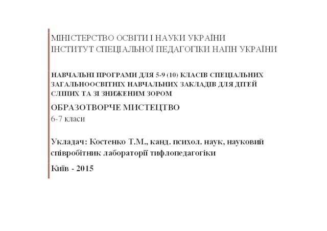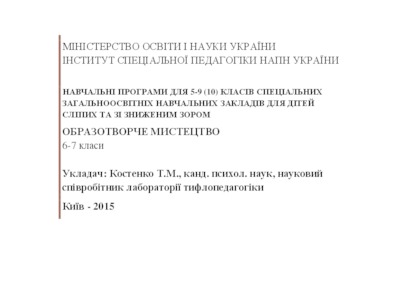 Program in visual art for grades 6-7 meets the cognitive and educational abilities of students with visual impairments. Prior to this programme added a new section "Focus coraccio-rozvitku work" which revealed remedial rozvitku work on the fine art of students with visual impairments at all useful lines of course. This work is also based on the principles of competence-based, cognitive-communicative, student-centered and activity approaches to learning.