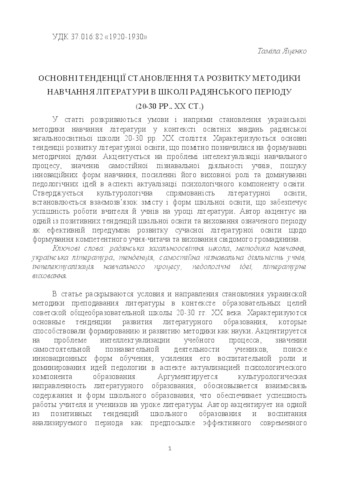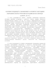 In this article the methodical properties and ways of Ukrainian literature teaching methodology development in context of educational issues of Soviet Union school in 20-30th of the XX centuries is considered. The main trends in literature education development that are influenced on methodical thought formation are characterised. The intellectualisation of educational process, the new study forms search, the increase of its educative part and pedagogical ideas domination in connection of psychological educational component actualisation is emphasised. The cultural direction of literature education is confirmed; the interaction of content and ways of school education that provide teacher’s and student’s work success at the literature lesson is established. The positive trends of school literature educational practise development such as native language education, educational orientation on student’s personal self-education, the student’s not only knowledge formation but also tries of educational system decentralisation etc. are distinguished. The general trend of illustrative literature teaching at school is negative evaluated. The author emphasised that positive teaching trends and training of indicated period became successful conditions of effective literature education and competent reader and citizen education of the second part of ХХ - beginning of ХХI centuries.
