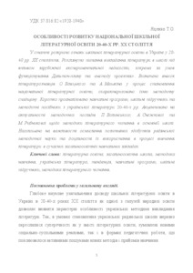 In this article the Ukrainian school literature education features in 20-40 of XX century is observed. The question of teaching Literature at school that is influenced by foreign literature, especially under “Dalton-plan” and “projects method” is considered. The contribution of O. Biletskyi and A. Mashkin in the national literature education development process is determined and their methodical heritage is characterized. The educational programmes, school books and methodical textbooks of Ukrainian literature in 20-40 years are shortly analyzed. The actual methodical views of P. Volynskyi, A. Snezhkova and M. Rybnykova on literature reading methods in secondary school are accented. The importance of positive achievements understanding of Soviet methodical science and expedience of their use in literature educational process in modern school is emphasized.