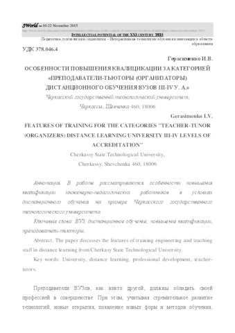 - Герасименко, І.В. (2015) Features of training for categories "Teacher-tunor (organizers) distance laerning university III-IV levels of accreditation" Мир науки и инноваций, 2. pp. 3-5. ISSN 2410-6615