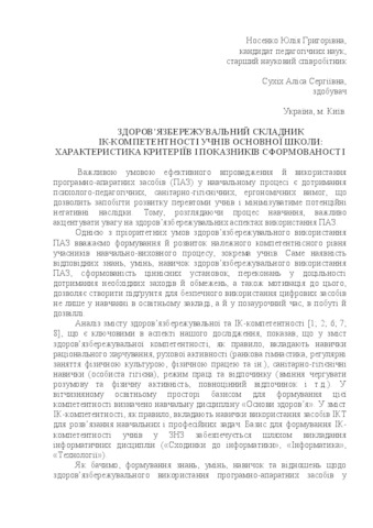 - Носенко, Ю.Г. and Сухіх, А.С. (2016) Health-saving component of secondary school pupils' ICT-competence: characteristic of the criteria and indicators of its formation In: Збірник тез доповідей Міжнародної науково-практичної конференції «Модернізація інформаційно-ресурсного забезпечення освітнього простору навчальних закладів» . Науково-методичний центр інформаційно-аналітичного забезпечення діяльності вищих навчальних закладів «Агроосвіта», м. Київ, Україна, pp. 81-83.