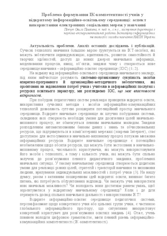 - Пінчук, О.П. (2016) The issue of forming of students’ competence in open information and educational environment: the aspect of use of social networking in education. Комп’ютер у школі та сім’ї, 8. pp. 4-10. ISSN 2307-9851