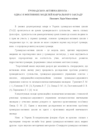 - Попович, Л.М. (orcid.org/0000-0001-8231-8124) (2016) Community schools - one of the most effective models of educational institution In: Освітні інновації:філософія, психологія, педагогіка: матеріали ІІІ Міжнародної науково-практичної конференції , 3 . ФОП Цьома С.П., м. Суми, Україна, pp. 210-213. ISBN 978-617-7487-08-0