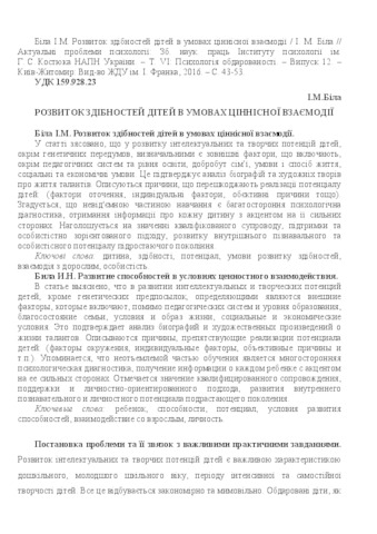 - Біла, І.М. (2016) Development of children's abilities in terms of value interaction Актуальні проблеми психології. – Т. VI: Психологія обдарованості (12). pp. 43-53. ISSN 2072-4772