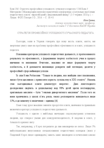 - Біла, І.М. (2016) Strategy modern teacher professional success In: І Міжнародної науково-практичної конференції «Актуальні проблеми педагогічної освіти: європейський і національний вимір” (3-5 червня 2016 р.), 3-5 червня 2016 р., м. Луцьк, Україна.