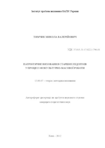 - Тимчик, М.В. (2012) Patriotic education of teenagers in the process of physical-media work Dissertation candidate2 thesis, Інститут проблем виховання.