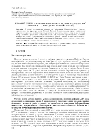 - Малицька, І.Д. (2016) High level of teacher’s IC-competency - key to improving the students’ digital literacy (Great Britain experience) Information Technologies and Learning Tools, 6 (56). pp. 164-175. ISSN 2076-8184