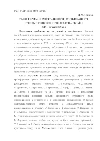 The transformation of the educational ideals merchant diverse segments of Ukrainian society within the legal framework of the Russian Empire. Revealed common features educational ideals of different layers of the merchant class (justifiable risk, economic pragmatism, strict religious, apolitical orientation). It was found that the main differences of merchant educational ideals were caused by property stratification condition and ethnic origin characteristics of its representatives were analyzed in the article. Attention is focused on the specifics of the educational ideal of Ukrainian merchants (dominance of Christian moral and spiritual values of utilitarian and pragmatic, respect for customers and partners, trust, restraint, deliberateness, cautioness, not great propensity for risk, temperance of business inquiries, apolitical efficiency, strong connection with the system of ideological orientations and values of the Russian Empire). Characterized the most significant changes in the structure of the merchant educational ideal: the significance educational growth of the semantic component, reorientation of focusin on important social affairs, the dominance of social responsibility and local patriotism).