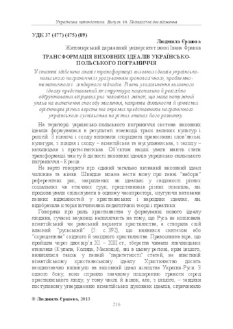 Taking into account the chronological, problem-thematic and gendered approaches in the article analyzes the transformation of educational ideals of the Ukrainian-Polish borderland. The educational ideal’s level of generalization is presented as a structure of nationally and religiously grounded exemplary traits of men and women who had a strong influence on the definition of way of thinking, areas of activity and value orientations of different groups and individual members of the boundary Ukrainian society at different stages of its development.