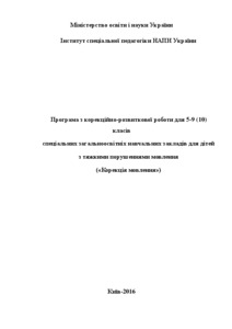 The program of remedial developmental work for 5-9 (10) special classes of secondary schools for children with severe speech disorders ( "Correction of speech") is a correctional program, which presents the work of overcoming speech disorders in the system of secondary and senior classes conditions of schooling. The program is designed for teachers, speech therapists special schools, speech therapy points vchytelivlohopediv education system, teaching staff, students and teachers of higher educational institutions and parents.