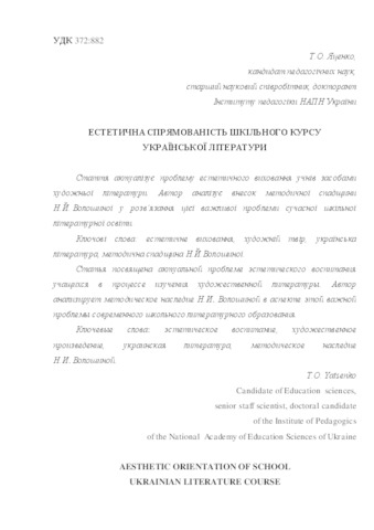 - Яценко, Таміла Олексіївна (2013) Aesthetic Orientation of School Ukrainian Literary Course Українська література в загальноосвітній школі, 5. pp. 29-31.