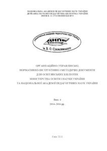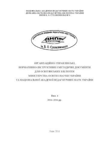 The fourth edition of the practical guide "Management, regulatory guidance documents and guidelines for educational libraries of the Ministry of education and science of Ukraine and National Academy of pedagogical Sciences of Ukraine" contains documents for the network of educational libraries of different types and types that are developed by scientists of the State scientific pedagogical library of Ukraine named. A. Sukhomlinsky during 2014-2016. Prepared the manual is intended for librarians of the network of educational libraries. It can also be used in the libraries of other systems and departments.